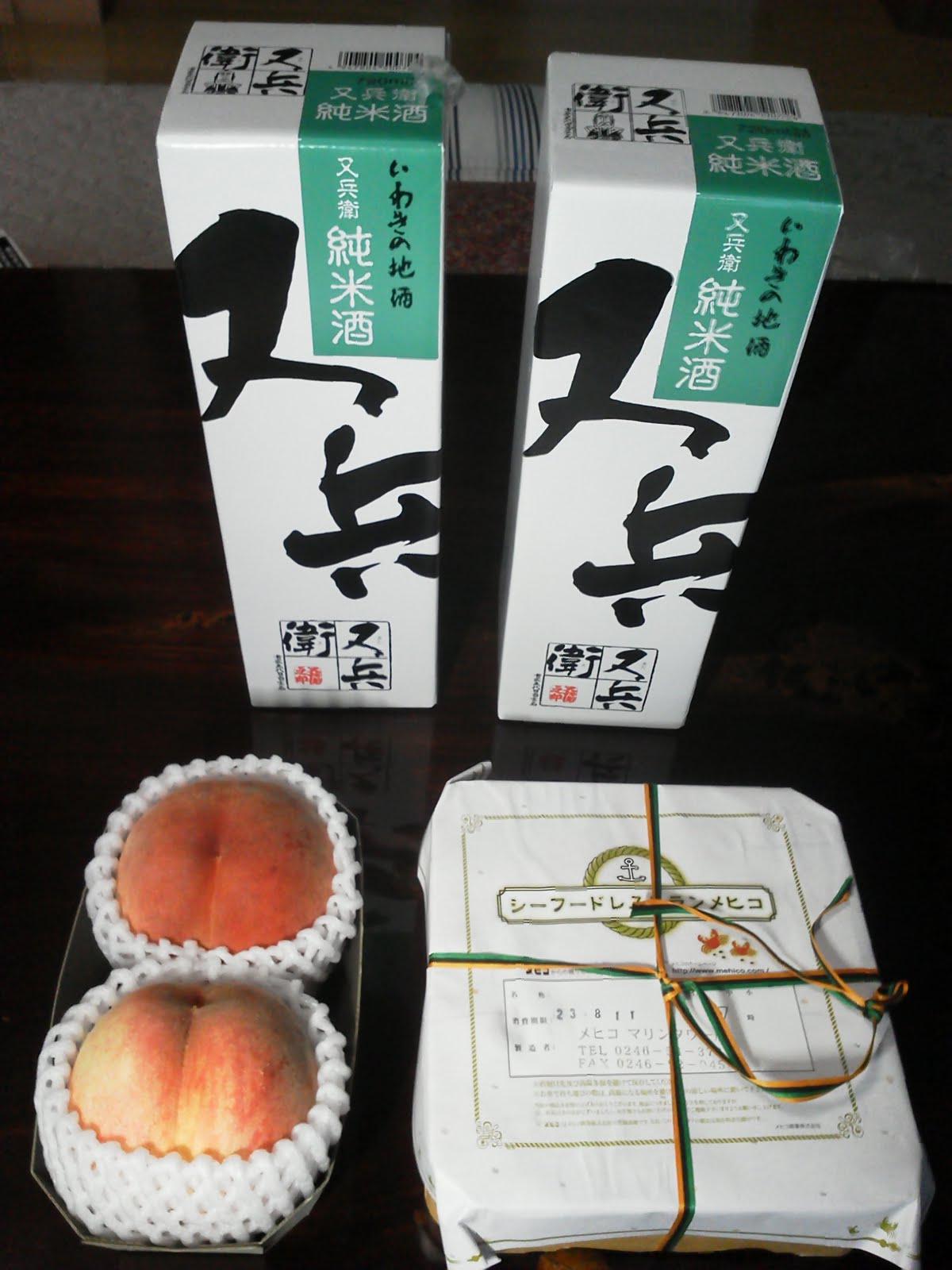いわき市の地酒「又兵衛」。福島県産の桃。更に地元レストランのカニピラフ折り詰め。もちろん食事もしましたよ。